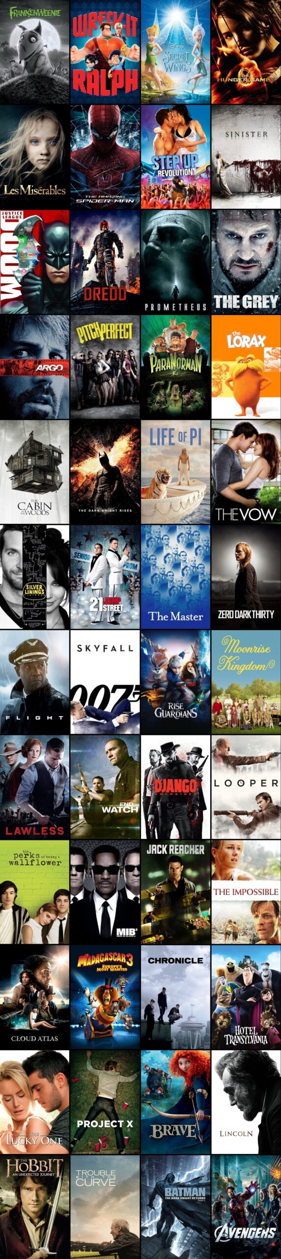 48 Unforgettable Movies of 2012. 2012 was a banner year for everything from rousing adventures and chilling thrillers to heart-warming dramas and laugh-out-loud comedies. Feast your eyes on all 48 posters below—then scroll through the seasonal tiers, pick your top three, and drop them in the comments! ⬇️